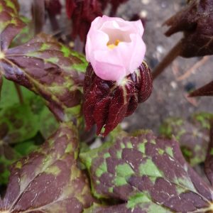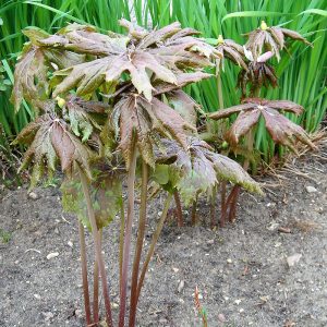 Himalajinis pėdlapis žydi gegužės mėnesį rausvais-baltais žiedais. Žydėjimas trunka apie dvi savaites, po jo suauga dideli, karpyti lapai ir užsimega vaisiai. Lapai per žydėjimą margi, vėliau bronziniai, o pilnai suaugę, pažaliuoja. Vaisiai didelės pailgos slyvos formos, išskirtinio raudono atspalvio, rūgštoko skonio, sunoksta rugpjūčio mėnesį. Valgomi, bet patinka ne visiems. Visos kitos augalo dalys nuodingos.