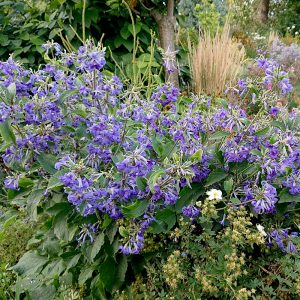Tai 1 – 1,5 m aukščio labai dekoratyvus puskrūmis, pradžioje stačiais, vėliau išlinkstančiais stiebais. Žydi mėlynais, 1,5 cm skersmens, nusvirusiais, taurelės pavidalo žiedais. Žydėti pradeda rugpjūčio pabaigoje ir žydi visą rugsėjį iki šalnų. Mėgsta drėgną dirvą, gali būti auginama ir saulėtoje vietoje, ir pusiau pavėsyje.