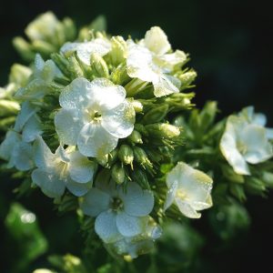 Žiedai: Žiedai smulkūs, iki 1,5 cm skersmens, kremiškai balti, su žaliais vainiklapių galais. Labai tankus žiedynas.